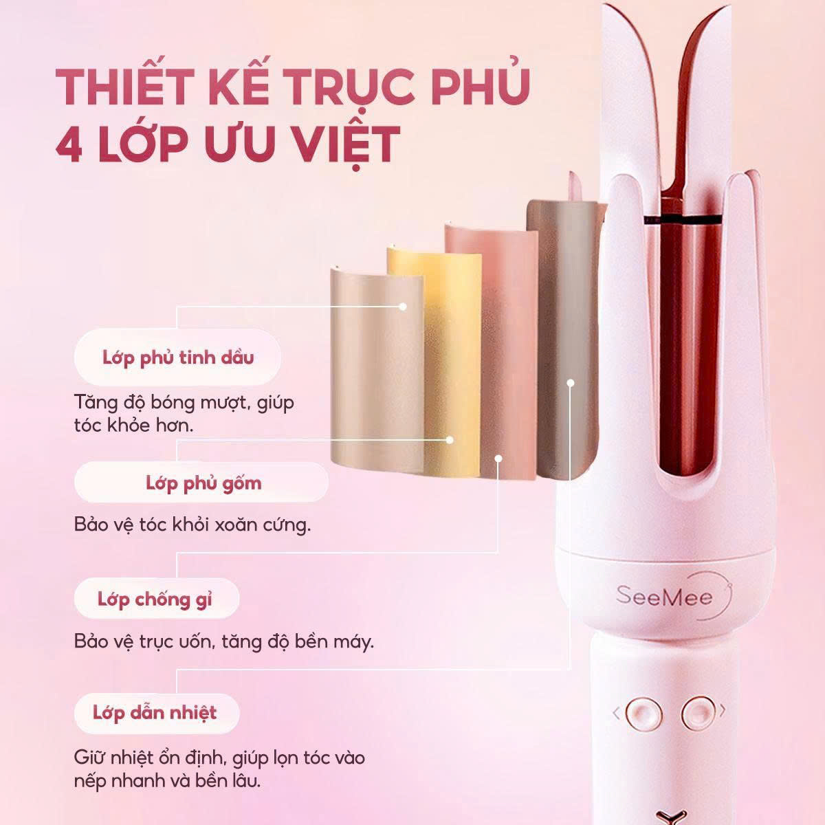 - Máy uốn tóc Seemee Dreamy là máy uốn có trục uốn gồm 4 lớp phủ: Lớp phủ gốm và ngọc trai, lớp phủ tinh dầu, lớp chống gỉ, lớp dẫn nhiệt. Thiết kế trục uốn có 4 lớp nhiệt giúp giữ tóc bóng mượt, mà vẫn tỏa nhiệt đều uốn xoăn tóc cho lọn
