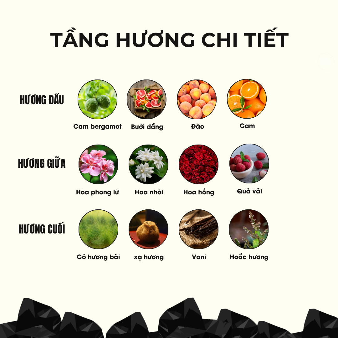 Hương giữa: Hoa phong lữ, Hoa nhài, Hương vải, Hoa hồng