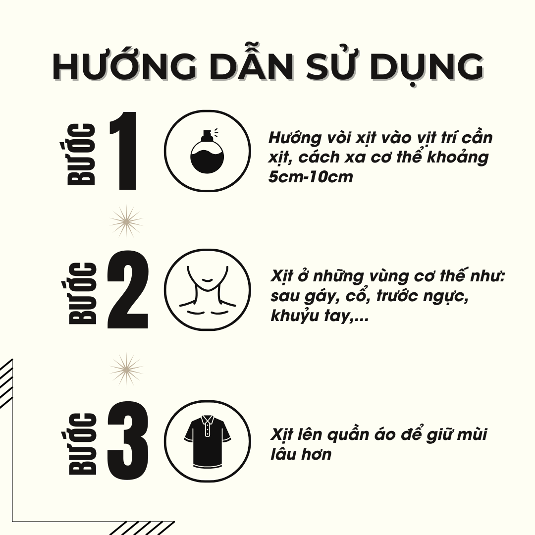 Giữ chai nước hoa khoảng cách 10 - 15cm từ cơ thể và xịt vào những điểm nóng trên cơ thể. Đợi vài giây để nước hoa thẩm thấu vào da trước khi di chuyển.