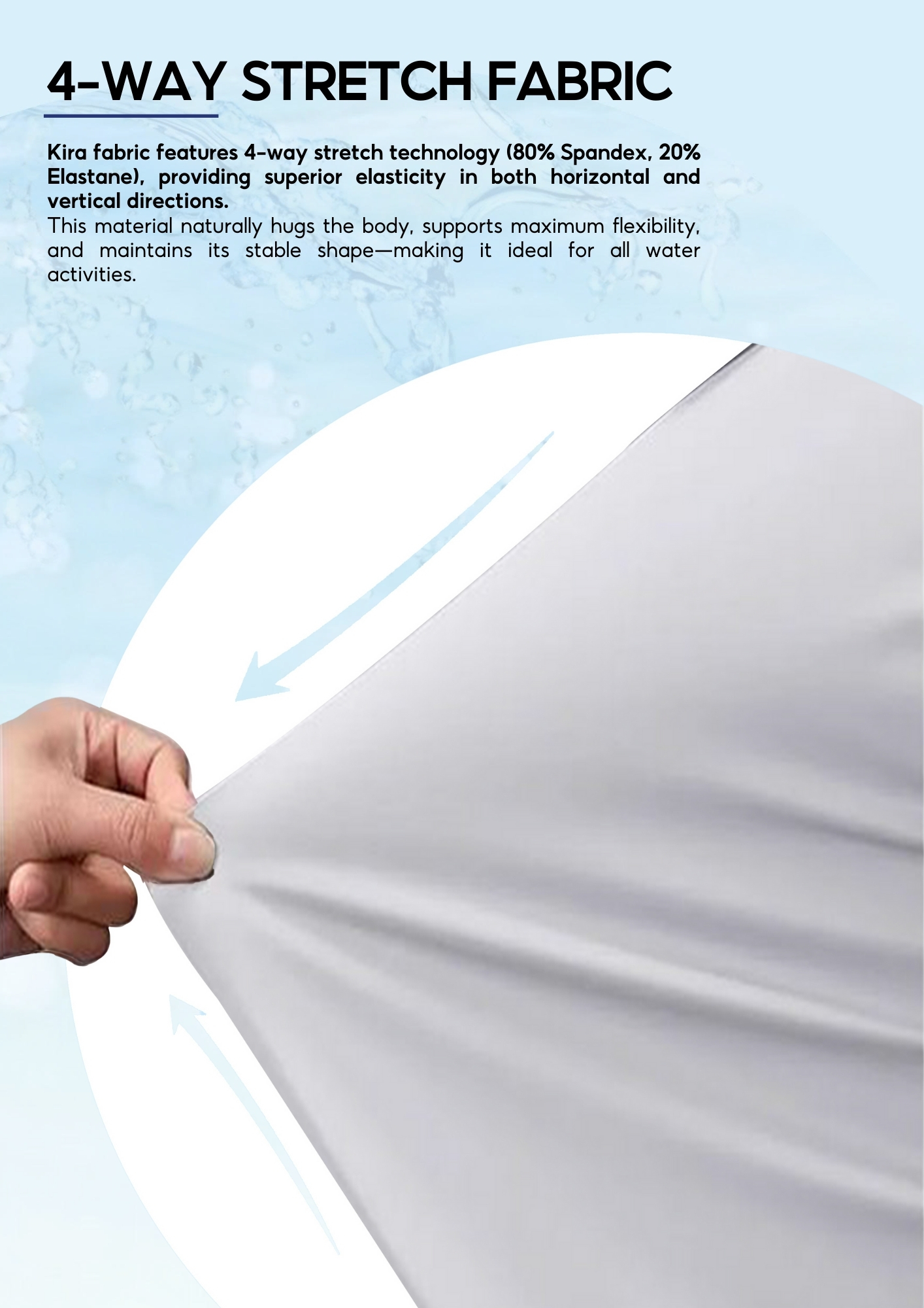 Đồ bơi thích ứng tốt với nước biển và ánh nắng mặt trời, hạn chế bị mục hay ăn mòn. Các sản phẩm được sản xuất bằng chất liệu thun 4 chiều từ Italia với độ co giãn cao, đàn hồi tốt (Fabrics: 80% PA, 20% EA) và chống tới 98% các tia tử ngoại (UV) mang đến sự thoải mái, dễ chịu khi vận động.