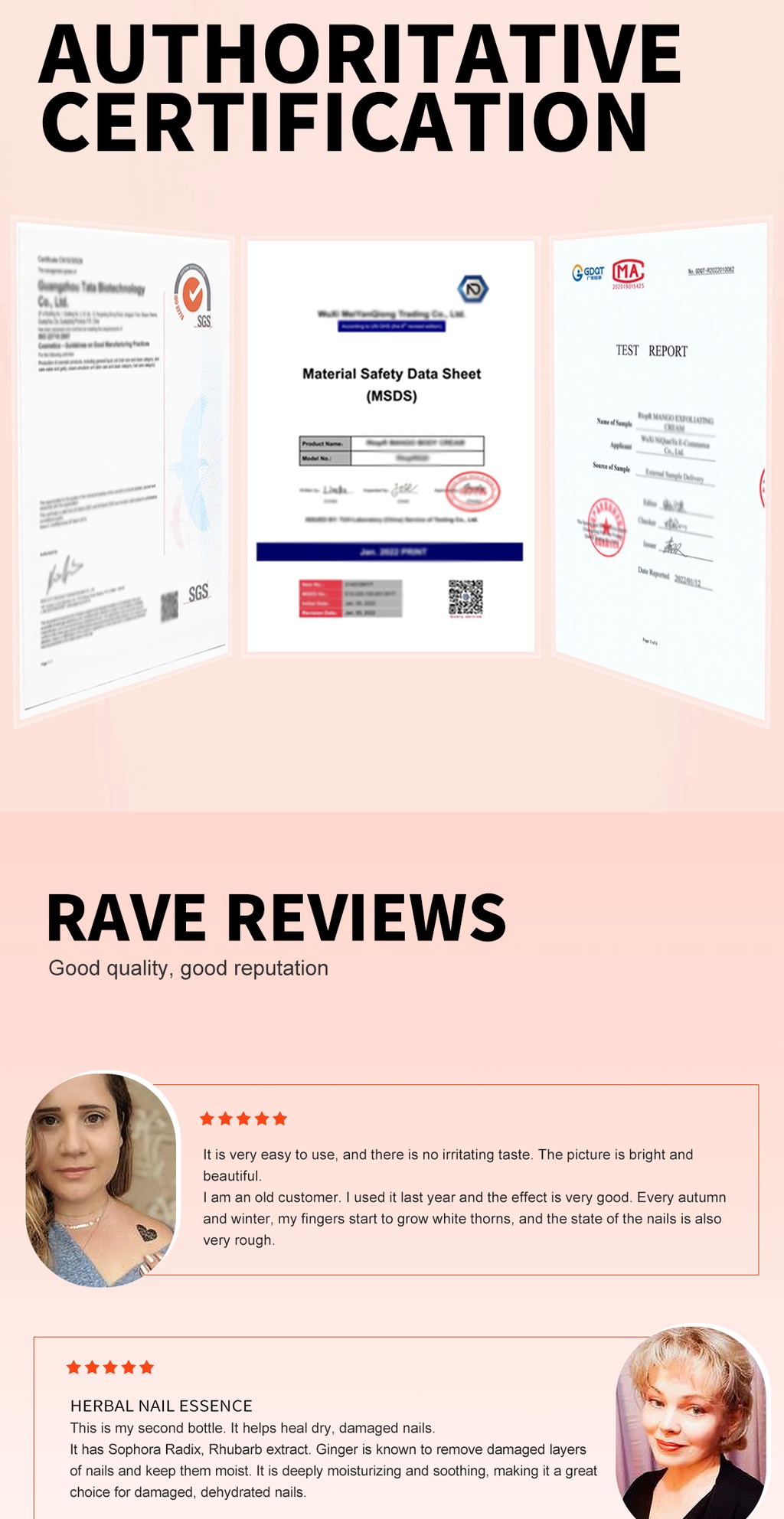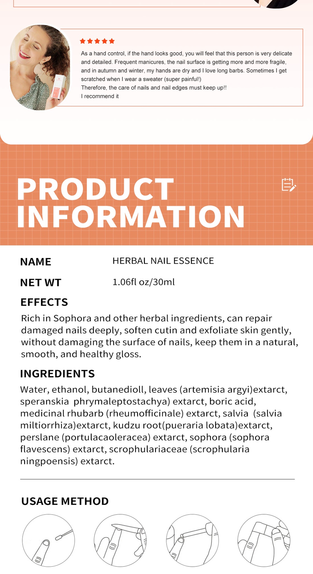 Chứa các thành phần thảo mộc như rễ cây, sophora, cây kim tiền thảo,... có tác dụng sửa chữa và nuôi dưỡng, làm sáng móng và làm cho móng mịn và bóng.