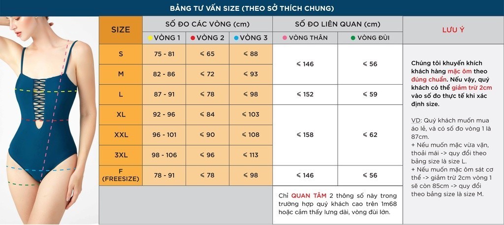 Phom size đồ bơi sẽ khác với quần áo thông thường và khi mặc sẽ ôm sát vào người (dễ lộ khuyết điểm hơn) nên nếu chỉ dựa vào chiều cao + cân nặng để chọn size sẽ KHÔNG chính xác. Do vậy, phiền nàng đo chính xác số đo các vòng cơ thể (ngực, eo, mông) việc để lựa chọn & tư vấn size được chính xác.