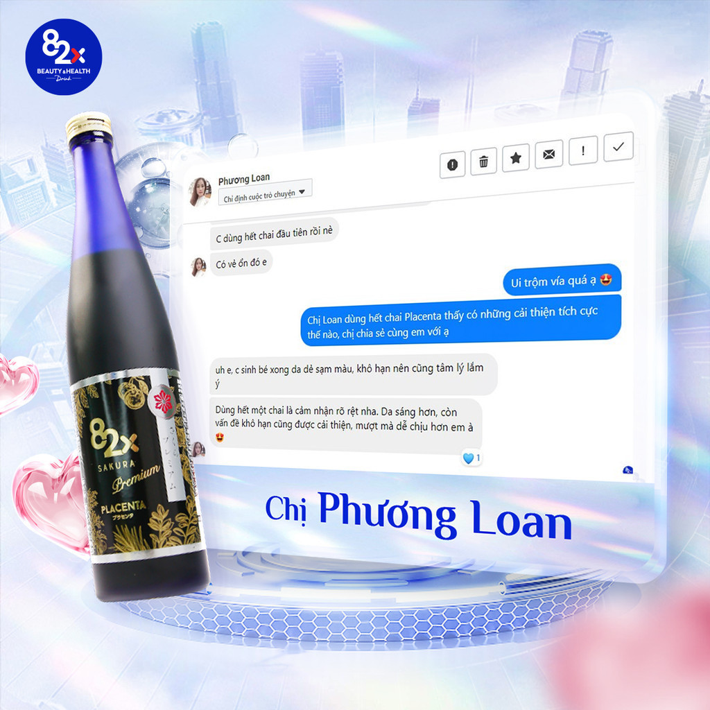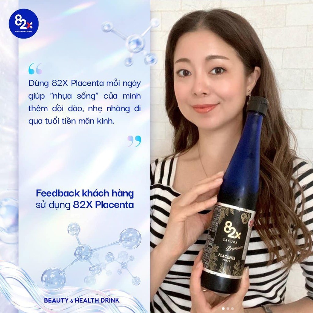 Nhiều người nổi tiếng U40 đã chứng nhận tính hiệu quả của 82X Sakura Placenta trong việc duy trì vẻ đẹp trẻ trung, mang đến làn da tươi sáng như Hà Anh, Phạm Quỳnh Anh, Linh Nga,... HƯỚNG DẪN SỬ DỤNG- Sử dụng đều đặn 15ml Placenta mỗi ngày sau ăn (6-8h sáng hoặc 10-11h tối) để có làn da đẹp như ý, tự tin với làn da sáng mịn rạng rỡ. - Sản phẩm không có chất bảo quản và không có tạo ngọt nên phải cất tủ lạnh sau khi mở nắp, tối đa 2 tháng sau khi mở nắpVới hàm lượng dưỡng chất cao nên sau khi sử dụng hết 1 liệu trình là da đã rất đẹp rồi (sau đó nghỉ ngơi 1-2 tháng) để hấp thụ đầy đủ dưỡng chất cũng như để cơ thể nghỉ ngơi. 1 năm kiên trì sử dụng sản phẩm không chỉ giúp làm đẹp da mà còn bổ sung rất nhiều vitamin và khoáng chất tốt cho làn da và cơ thể