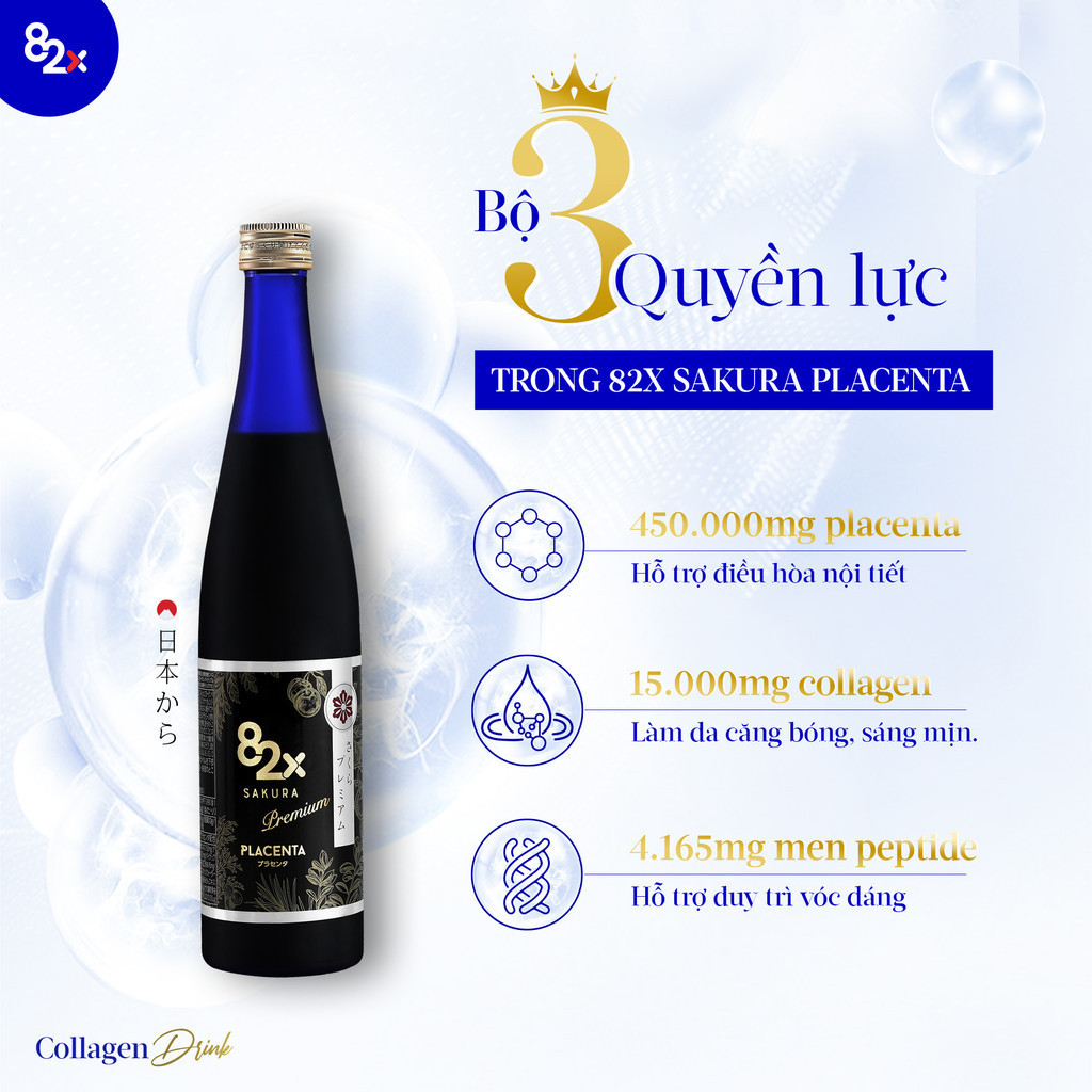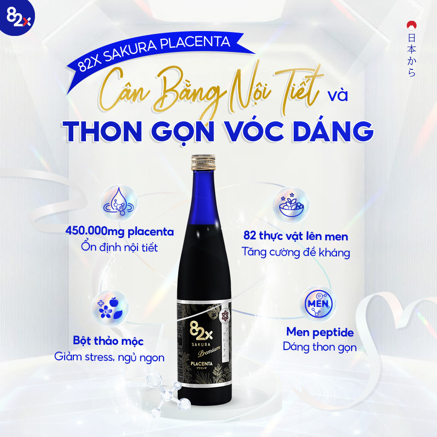 Nước Uống Đẹp Da 82X SAKURA PLACENTA PREMIUM Dòng Cao Cấp 500ml - Cân Bằng Nội Tiết, Cải Thiện Giấc Ngủ, Sáng Đều Màu DaTHÔNG TIN THƯƠNG HIỆU:Thương hiệu: 82XNơi sản xuất: Nhật BảnDung tích: 500ml / ChaiHạn sử dụng: 24 tháng